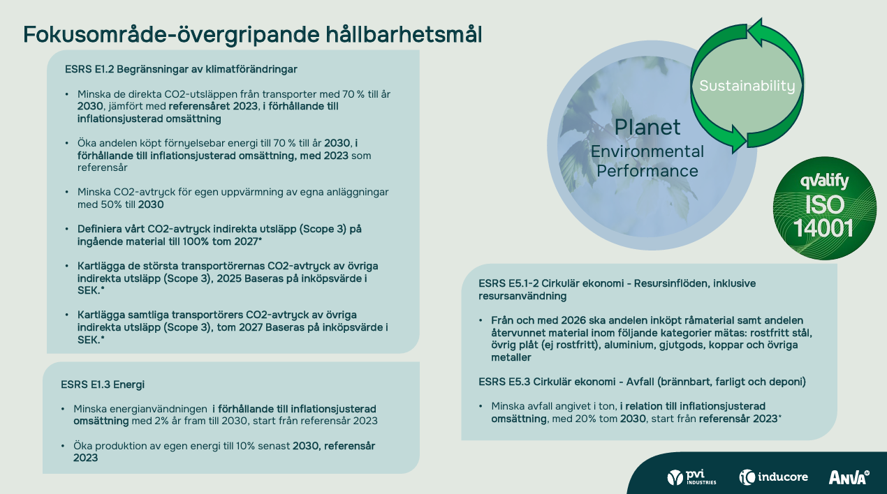 Ett av de viktigaste syftena med vårt hållbarhetsarbete är att minska de negativa miljöeffekterna av våra verksamheter. Vi är en ung industrigrupp som har ambitionen att ständigt utvecklas. Våra målsättningar är bland annat att minska energianvändning och koldioxidutsläpp. Genom ett identifiera energibehovet vid våra produktionsanläggningar och därefter jobba aktivt med att minska användningen har vi lyckats minska våra utsläpp vid flera anläggningar runt om i landet där vi har produktionsverksamhet, från Kalix till Trollhättan. Läs gärna om exempel på vårt arbete.